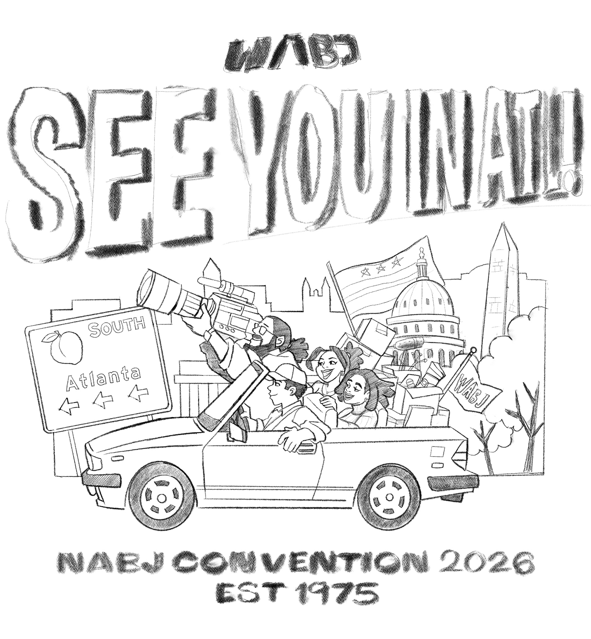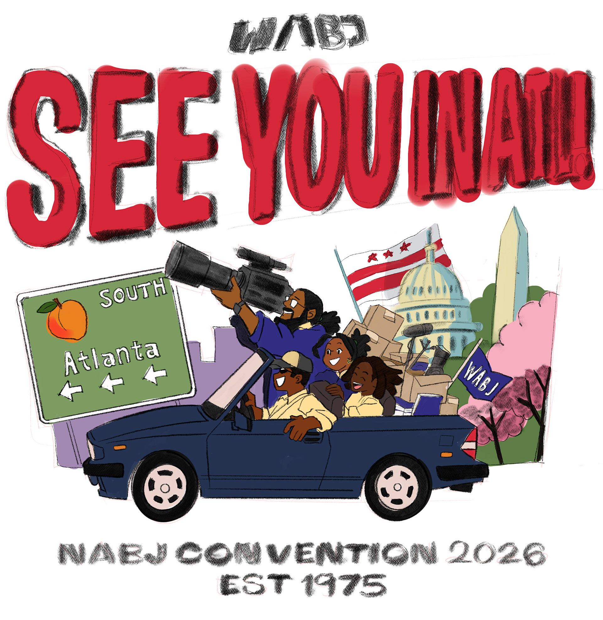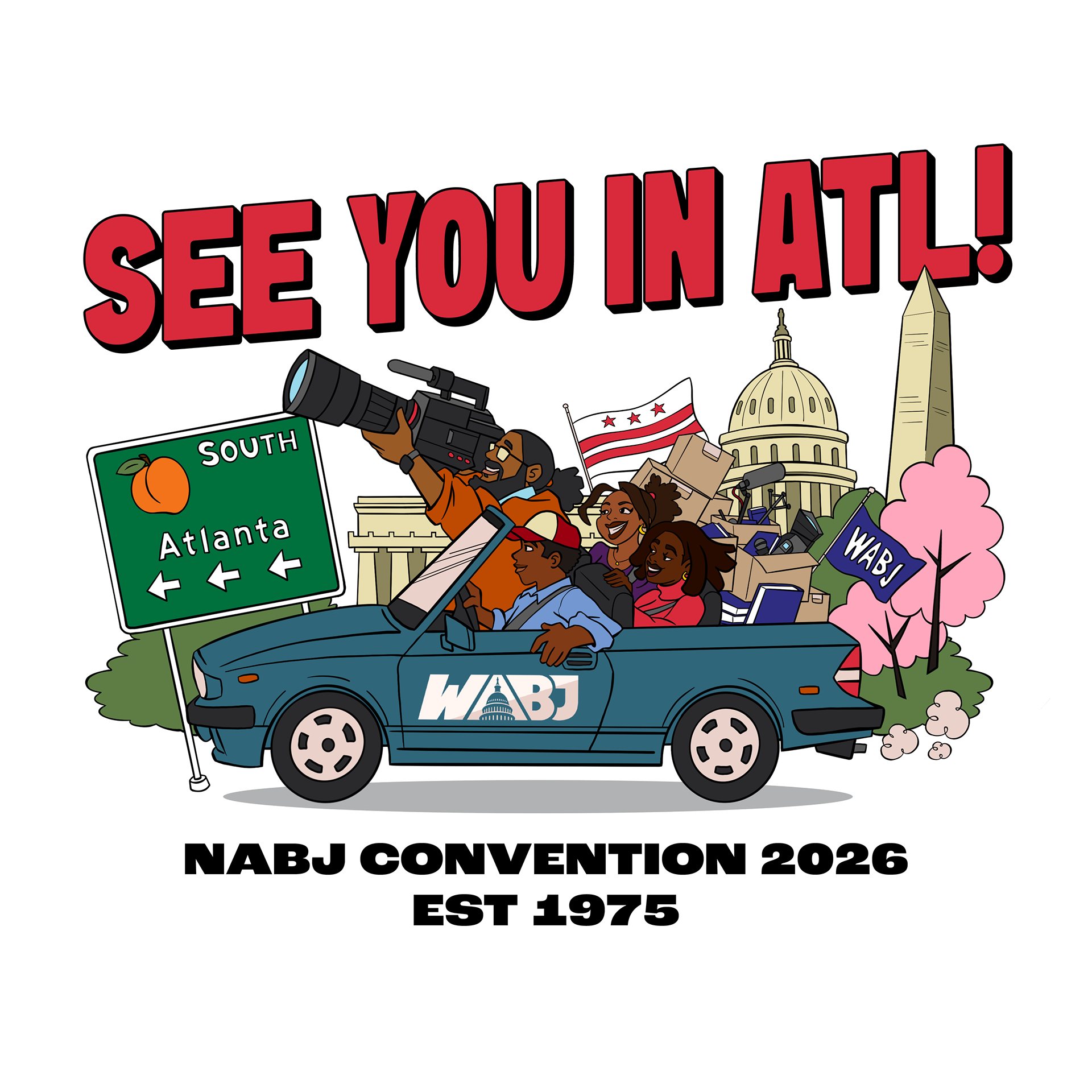 This T-shirt design was commissioned by my brother, Philip Lewis, President of the Washington Association of Black Journalists chapter and Deputy Editor at HuffPost. The goal was to create a bold 1990s-inspired graphic celebrating Washington, D.C. and Black journalists attending the NABJ Convention in Atlanta. The illustration shows a group of journalists traveling from D.C. to Atlanta, using bright colors and expressive characters to capture the energy of classic 90s event tees.