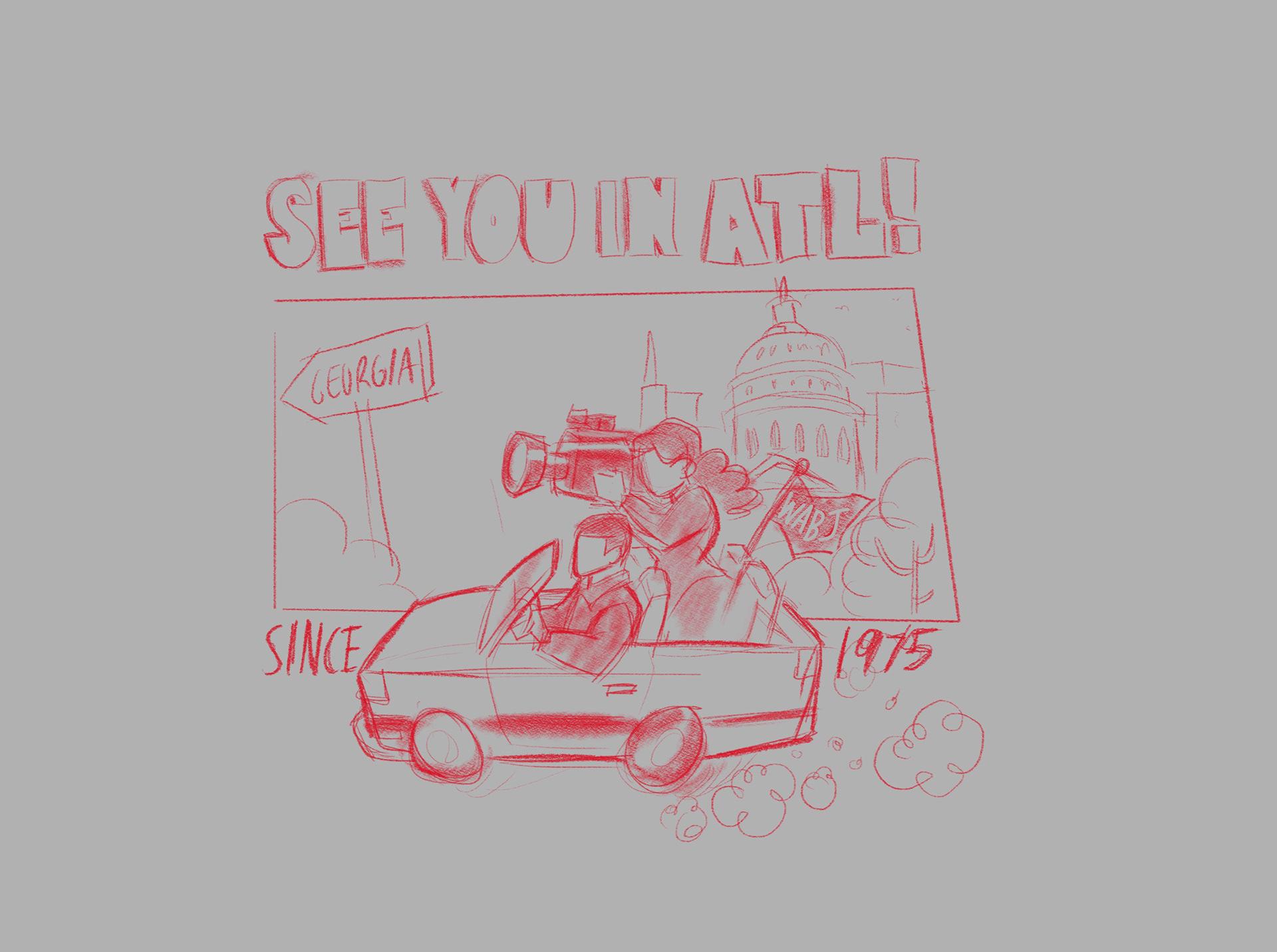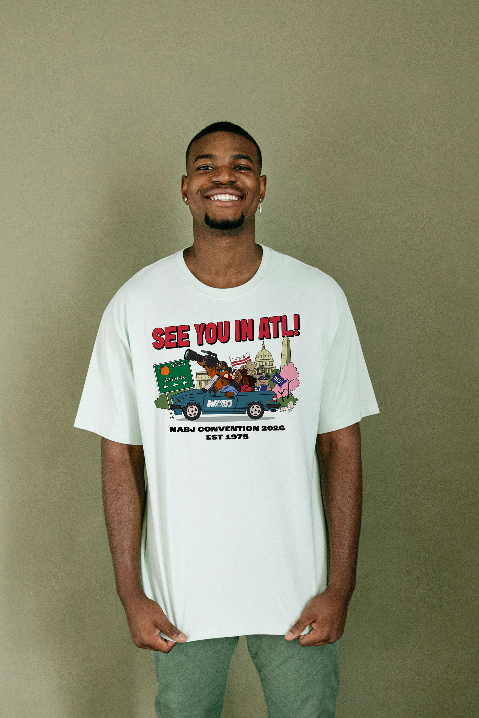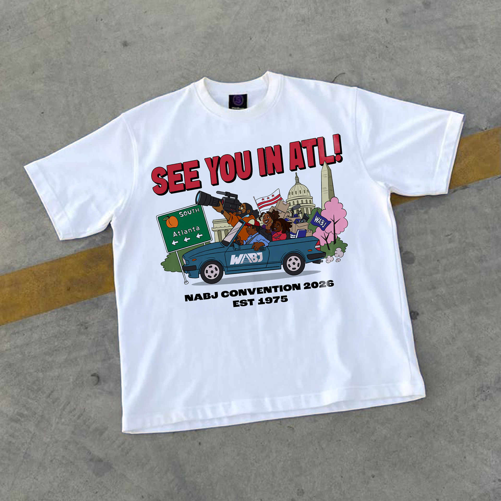 This T-shirt design was commissioned by my brother, Philip Lewis, President of the Washington Association of Black Journalists chapter and Deputy Editor at HuffPost. The goal was to create a bold 1990s-inspired graphic celebrating Washington, D.C. and Black journalists attending the NABJ Convention in Atlanta. The illustration shows a group of journalists traveling from D.C. to Atlanta, using bright colors and expressive characters to capture the energy of classic 90s event tees.